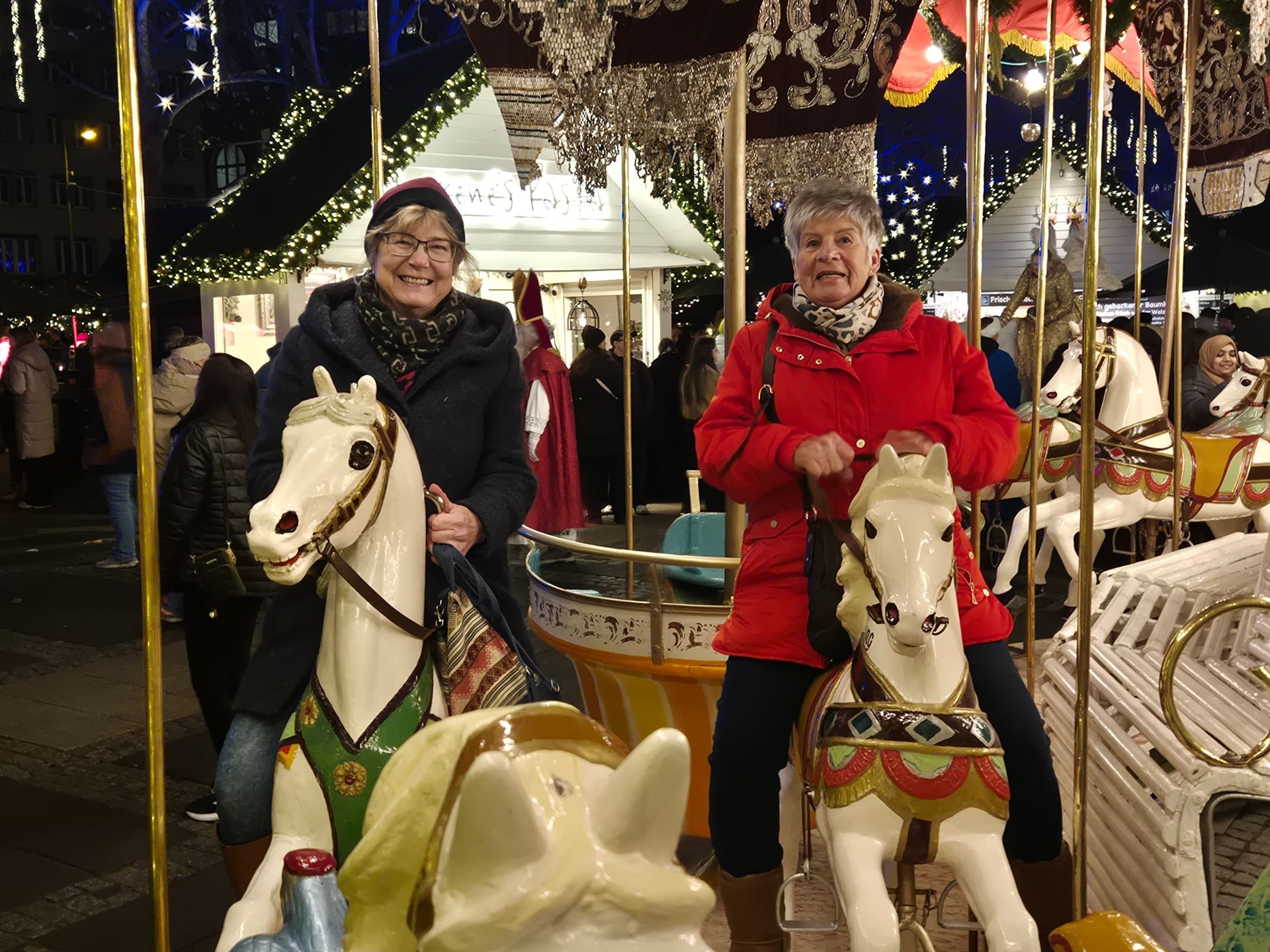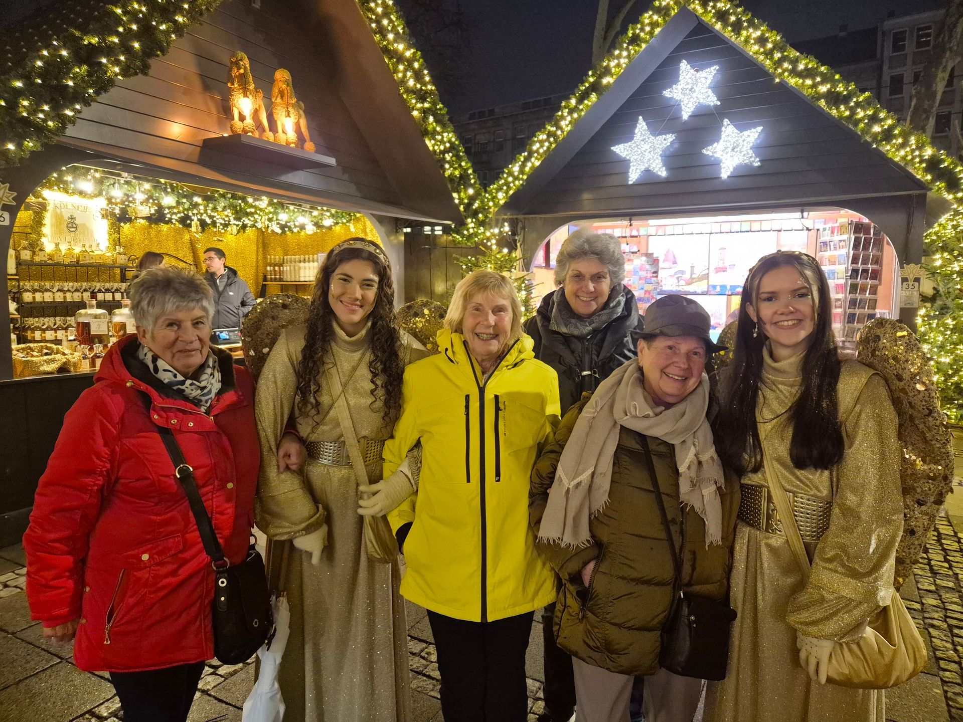 Zum vereinbarten Zeitpunkt waren alle wieder vollzählig versammelt und schnell kam die nächste Straßenbahn. Schon war man unterwegs zum „Markt der Engel“ am Neumarkt. Hier faszinierten erst einmal die vielen leuchtenden Sternen, die Eiskristalle und die illuminierten Eiszapfen, mit denen die Bäume, ja der ganze Himmel dekoriert waren. Man musste stehen bleiben und schauen. Dann wurde durch die Gassen mit den verzierten Häuschen flaniert und die unterschiedlichsten Angebote angeschaut. Wer mutig war, fuhr mit dem Karussell. Immer wieder begegnete man „Engeln“ in goldenen Gewändern, mal in Gruppen zu Fuß und sogar auf einem Schimmel. Als man sich zum verabredeten Zeitpunkt wieder traf, war man sich einig, dass hier eine ganz besondere Atmosphäre herrschte.