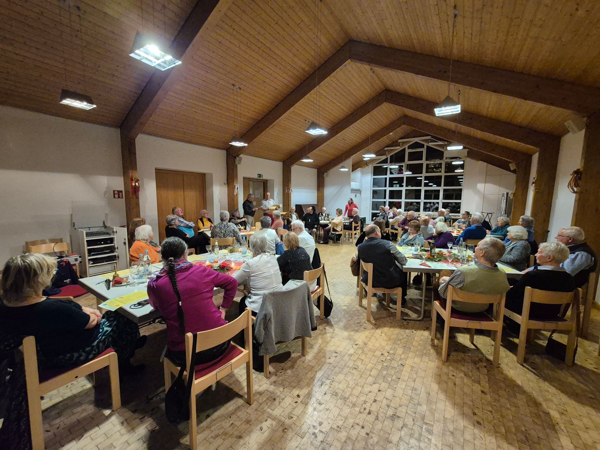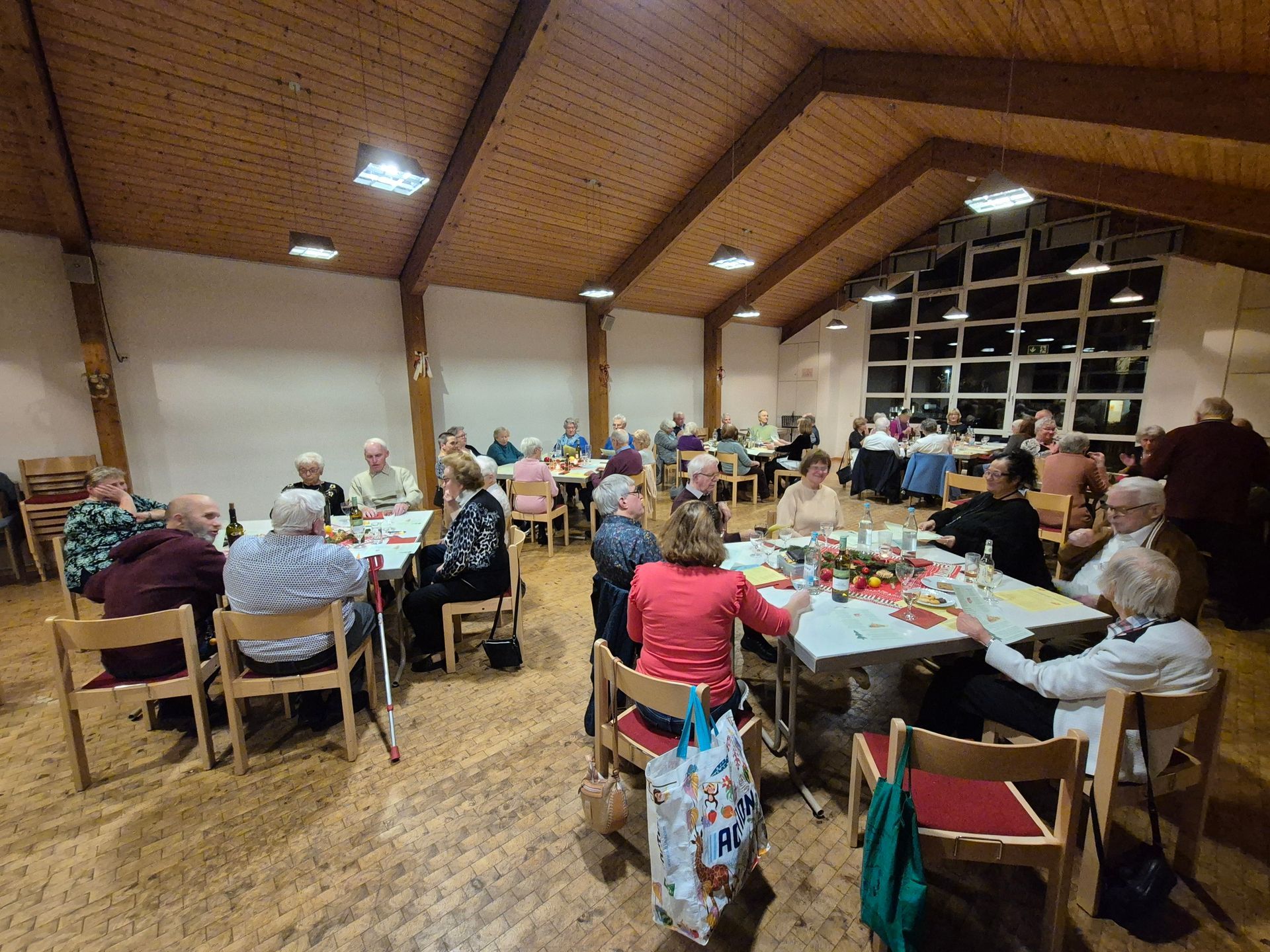 Der 9. Dezember 2025 war ein Dienstag. Es war der Tag der Adventfeier vom OGV Bensberg. Eingeladen war für 19.00 Uhr, aber schon um 18 Uhr waren ein paar der Gartenfreunde fleißig am Werk. Im evangelischen Gemeindezentrum in Bensberg wurden Tische gerückt und geschmückt. Es wurden Kerzen aufgestellt und Geschirr bereitgestellt, alles vorbereitet für die bevorstehende Adventfeier. Nach und nach trafen die Gäste ein und füllten auf den Tischen die bereitgestellten „süßen Teller“ mit mitgebrachten Köstlichkeiten. Man suchte sich seinen Platz und schnell füllte sich der Saal. Während die jungen Frauen der evangelischen Jugend, die jedes Jahr den Service übernehmen, eintrafen und sich in der Küche sortierten, baute im Foyer der Caterer das große Buffet auf.
